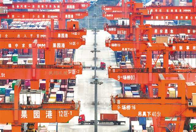 目前果园港建成18个5000吨级泊位、14条铁路专用线,年货物吞吐量超2600万吨,通达全球100多个国家和地区的300多个港口,是全国首个“双四星”认证内河港口。(首席记者 龙帆 摄/视觉重庆)