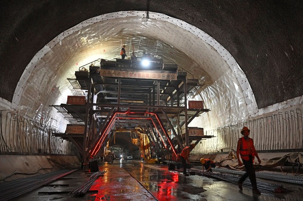 9月21日,苏家坪隧道内,技术工人正在进行贯通后的二衬施工。记者 罗斌 摄
