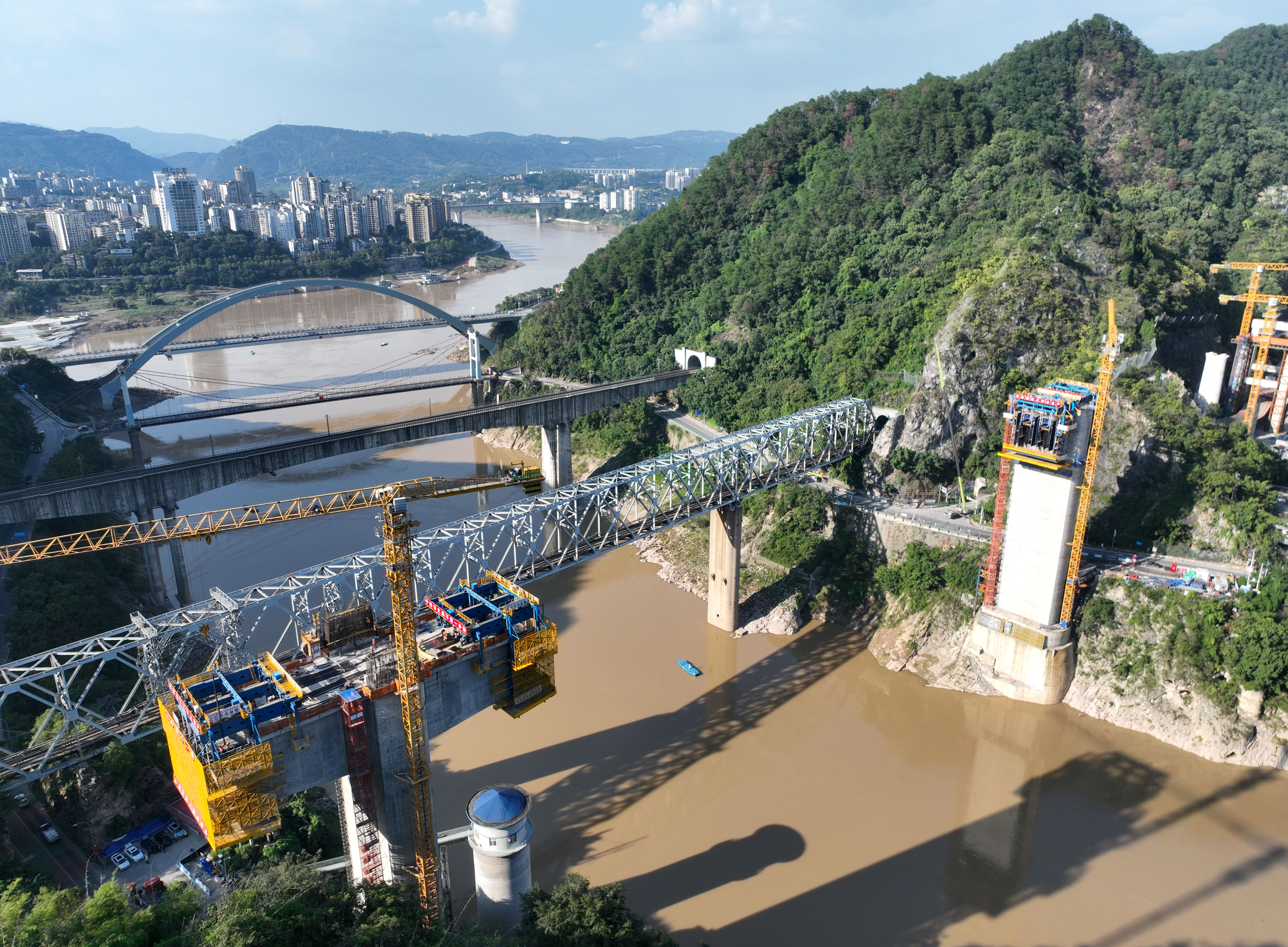 北碚天府嘉陵江特大桥全长874.1米,共计17个墩台,是该标段重点控制性工程。目前,西渝高铁北碚天府嘉陵江特大桥14号主墩已完成造桥机安装,15号主墩已完成4号节段浇筑,主桥架梁施工开始加速推进。