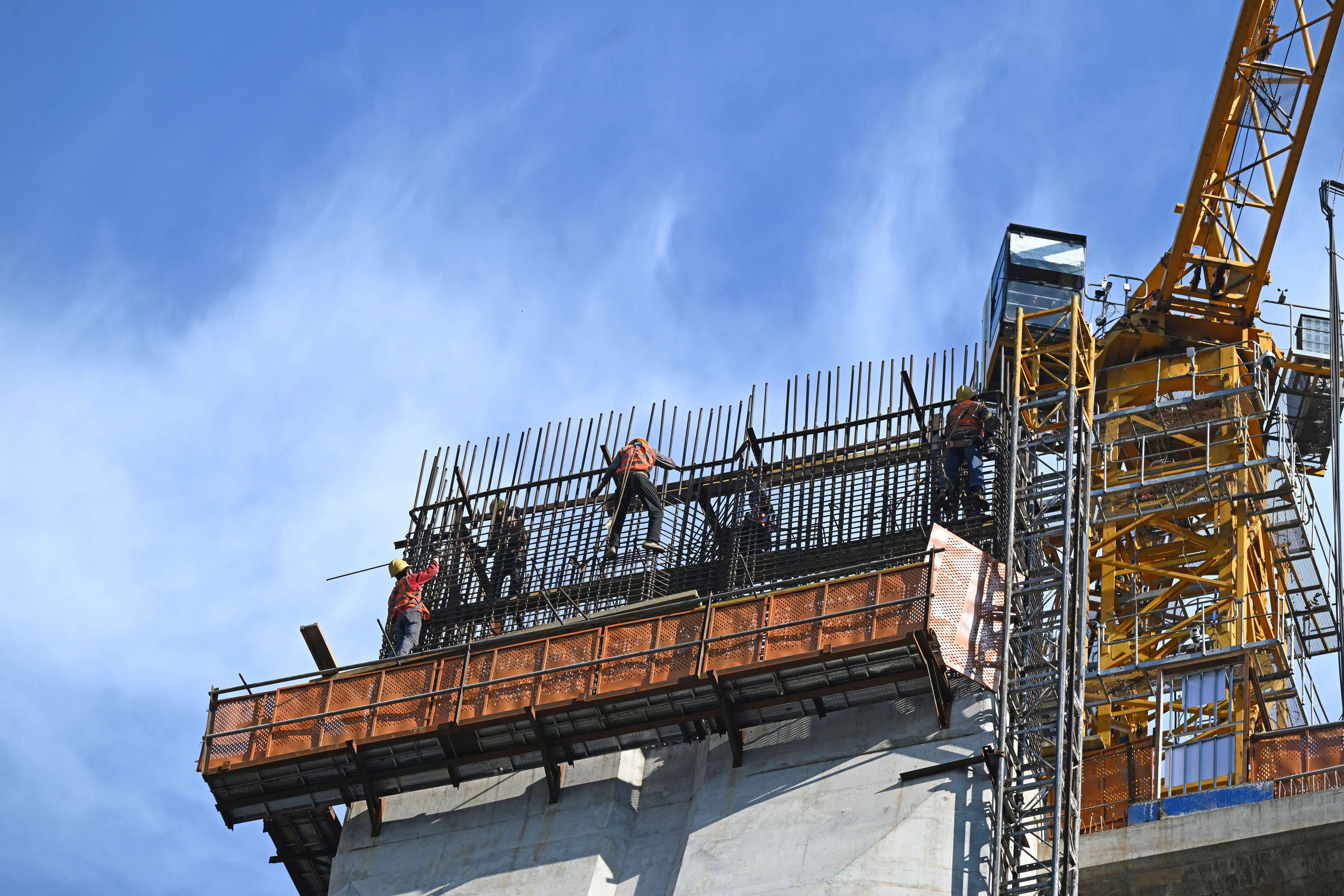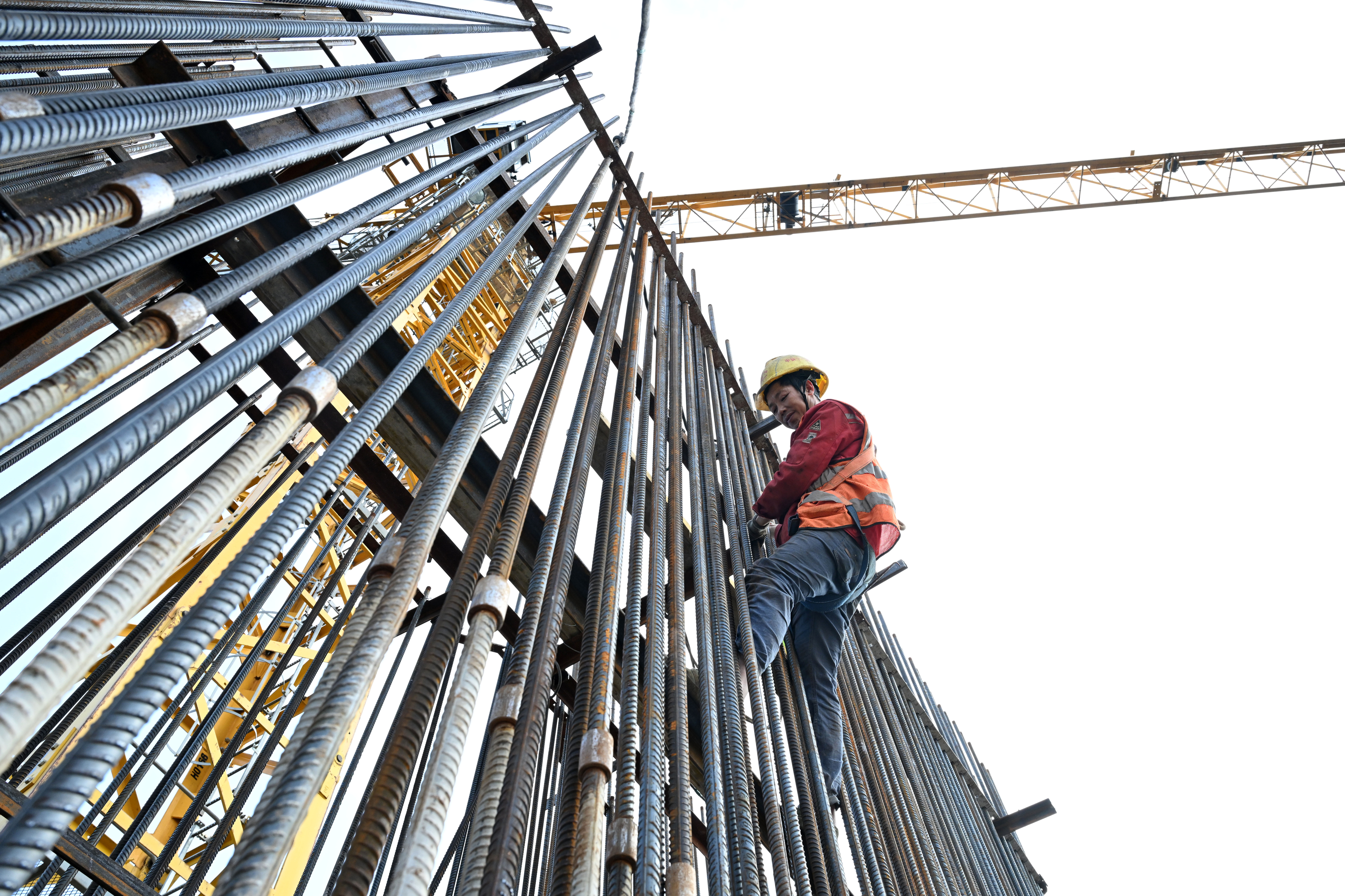 10月28日,在中铁十一局西渝高铁康渝段重庆枢纽1标项目建设现场,技术工人正在进行桥塔钢筋绑扎。记者 罗斌 摄