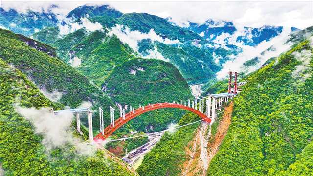 5月10日,巫镇高速公路东溪河特大桥正在进行桥梁架设施工。 截至目前,巫镇高速公路土建工程已经完成总体形象进度的91%,全线进入最后的冲刺阶段,路面、机电等附属设施安装全面展开,预计年内建成通车。 巫镇高速公路全长48.69公里,是目前连接渝陕两地的首条高速公路、构建鄂渝陕南北大通道的重要节点工程,全线桥隧比达到90.6%。这条路建成通车后,巫溪至陕西镇坪车程将从目前的3个半小时缩短至1小时以内。(记者 罗斌 摄/视觉重庆)