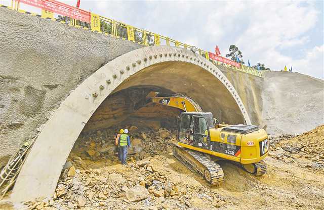 6月6日,成渝中线高铁缙云山隧道施工现场,施工人员正在加紧作业。 缙云山隧道于近日开始进洞施工,标志着成渝中线高铁控制性工程迎来重大突破。该隧道位于璧山区和沙坪坝区之间,全长约5700米。 成渝中线高铁是中国“八纵八横”高铁网沿江通道的重要组成部分,建成通车后,将推动川渝地区路网结构更加完善,极大便利沿线群众出行。(首席记者 龙帆 摄/视觉重庆)
