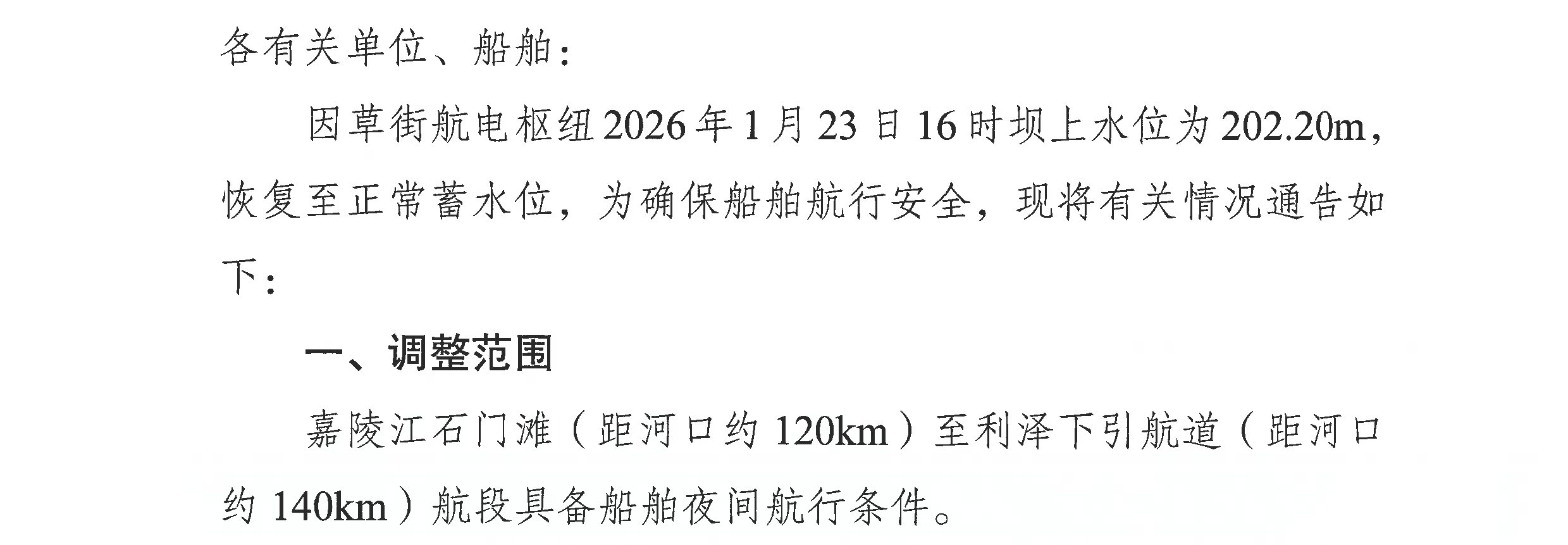 重庆市合川航道管理处关于嘉陵江石门滩至利泽下引航道恢复夜航的航道通告