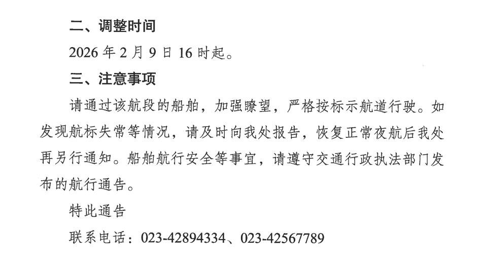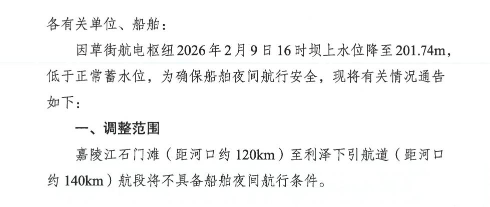 重庆市合川航道管理处关于嘉陵江石门滩至利泽下引航道航段不具备夜航条件的航道通告