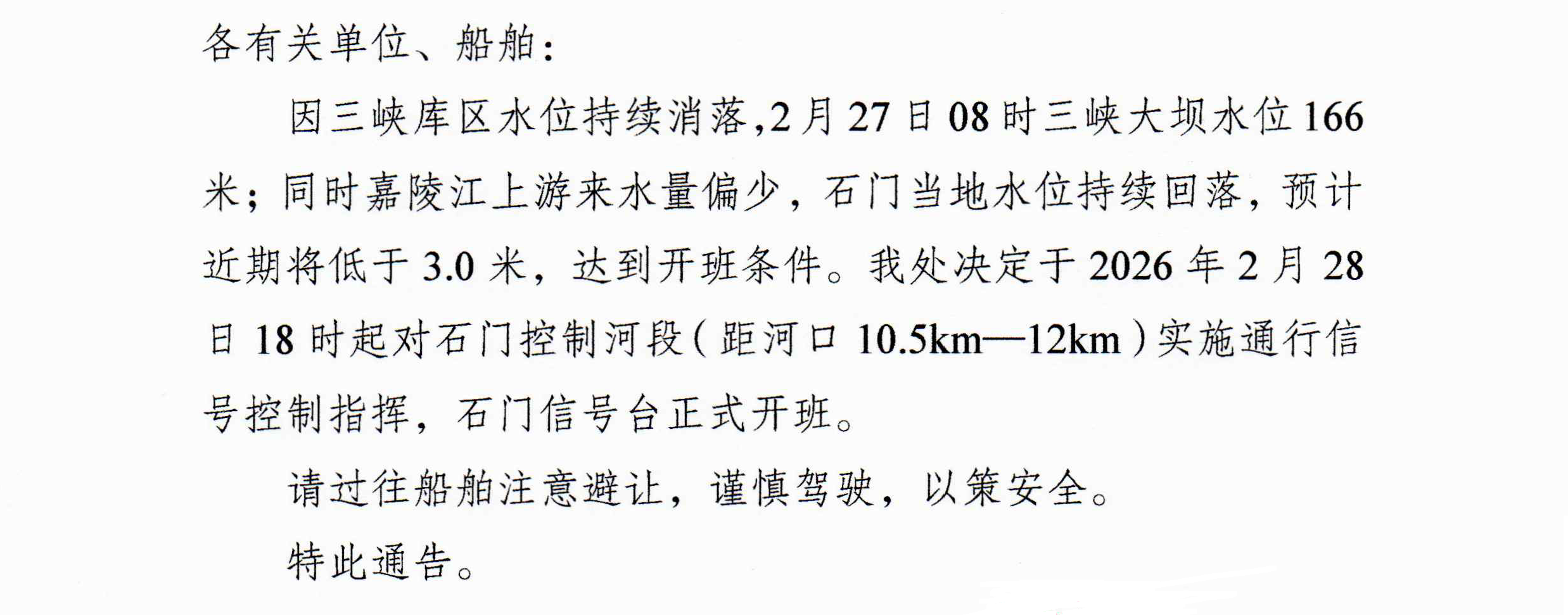 重庆市嘉陵江航道管理处关于石门信号台开台的航道通告