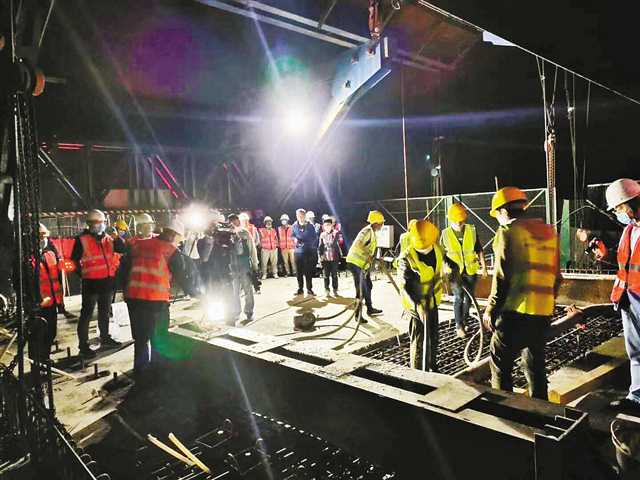 5月1日凌晨,施工人员奋战在大桥连续梁合龙施工现场。中铁十五局重庆铁路枢纽东环线项目部 供图
