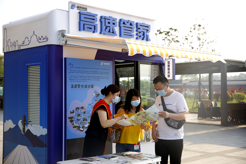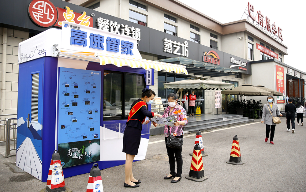 5月1日,G75巴南服务区,管家小铺工作人员为市民提供路引咨询服务。覃宇 摄