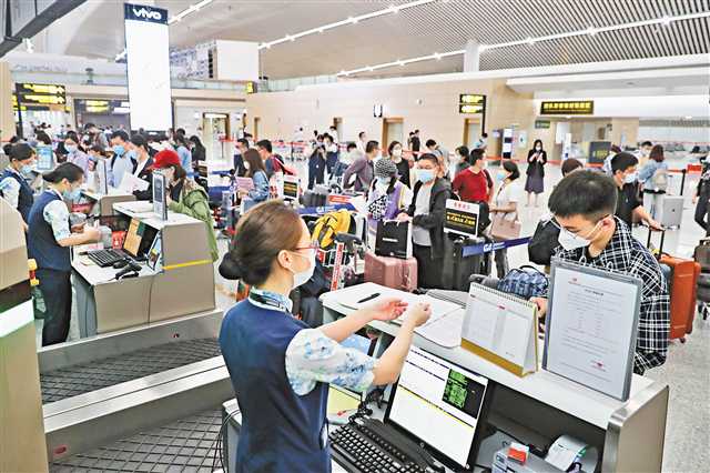 9月20日晚上22时许,江北国际机场T3航站楼国际值机岛,留学生在现场工作人员的指引下有序办理值机手续。(江北国际机场供图)