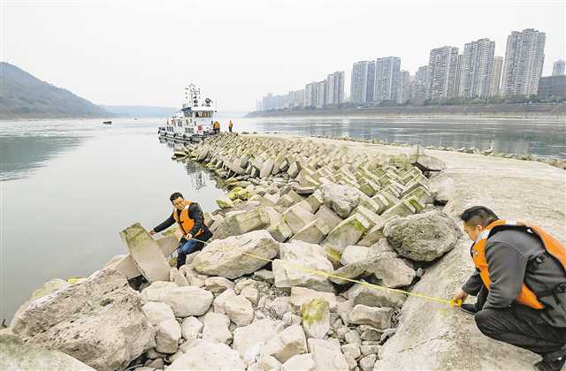 3月9日,长江航道江津段,航道工人利用枯水期排查去年特大洪峰对航道设施的损坏情况。 2月中旬,长江进入枯水期。3月上旬,中心城区多个重点险滩反复出现持续时间长的特枯水位。为此,长江重庆航道局提前对各重点浅滩的河床地形进行摸底,制定了相应保障措施,保障航道安全畅通。 记者 郑宇 摄/视觉重庆