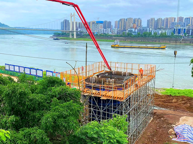 江津中渡街二变四道岔大桥长度339.25米,墩柱采用圆端形实体桥墩。此次首桩浇筑位于中渡街大桥2号桥墩,因桥梁整体结构左邻老成渝营业线、右临长江,施工面临施工地质复杂、营业线安全压力大、环保要求高等挑战。