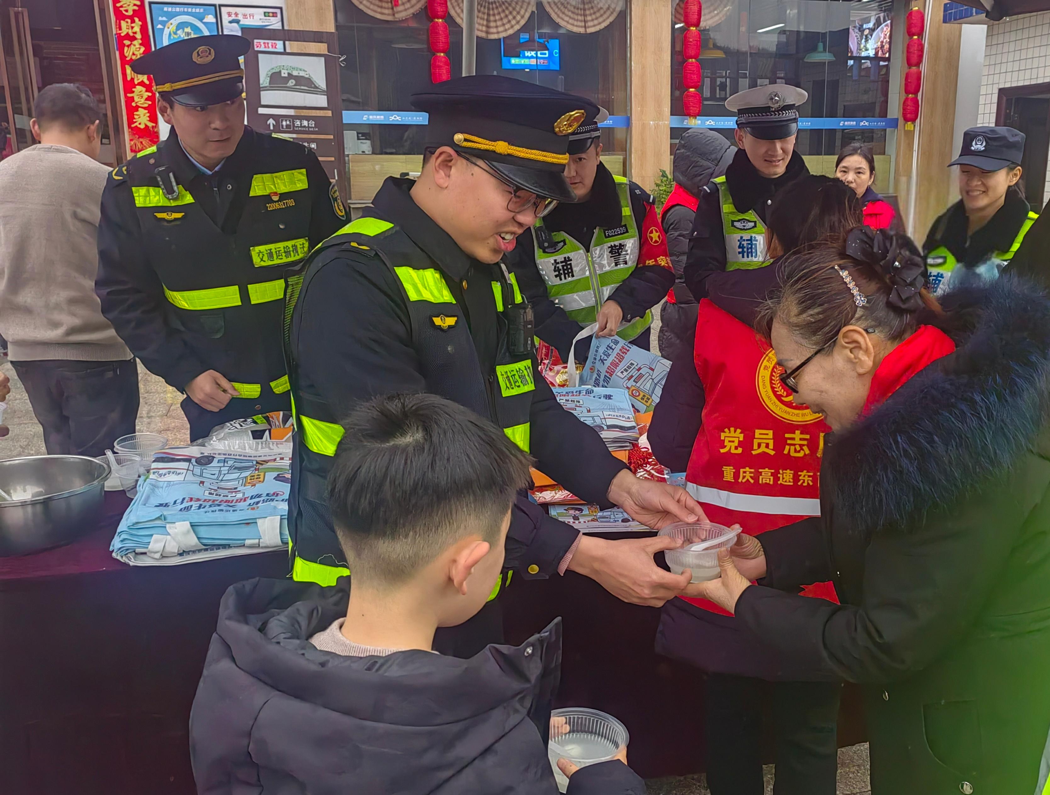 “师傅,元宵节快乐!吃碗汤圆暖暖身子!”在彭水服务区活动现场,志愿者将节日的祝福和热气腾腾的汤圆送到司乘手中,一句句温暖的祝福、一碗碗香甜的汤圆,在寒冷的天气中充满了重庆高速的温情。一位外出务工的女士接过汤圆感慨道:“没想到元宵节在重庆高速上还能吃到现煮的免费汤圆,这份心意真的比汤圆还甜!”志愿者热情的服务让外出的游子在路上也感受到“家”的温暖。