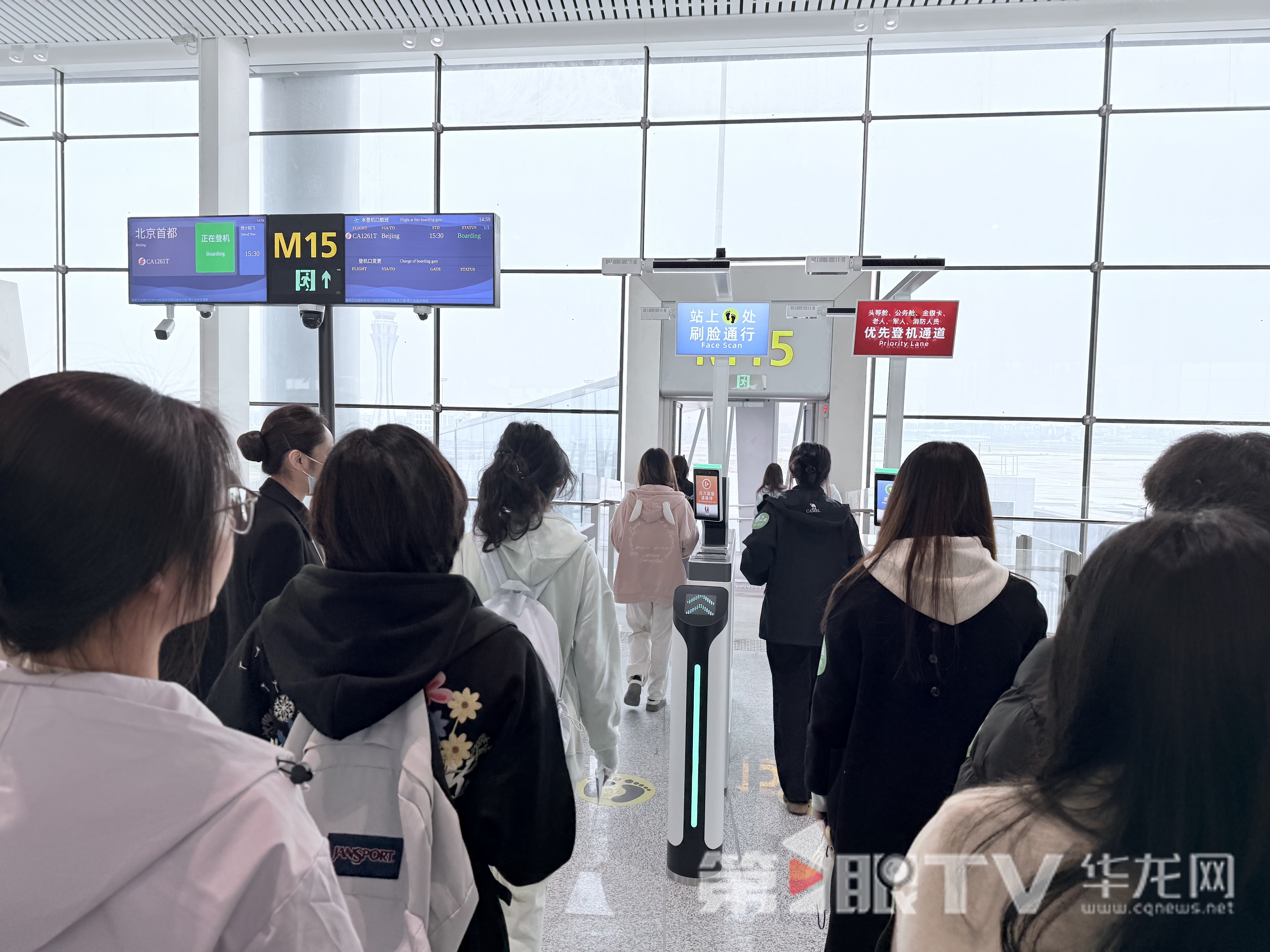部分学生在登机口体验人脸自动识别登机。第1眼TV-华龙网记者 谢鹏飞 摄