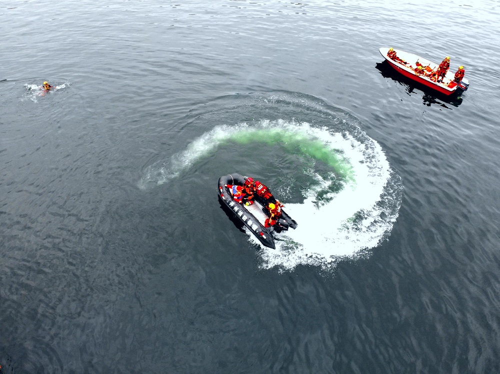 演练模拟一位游客不慎落水后需要紧急救援,接到险情后,救援队迅速启动应急预案,依托无人机空中侦察对落水者进行精准定位,救援人员驾驶橡皮艇、冲锋舟破浪疾驰抵达目标水域,通过专业救生设备快速将落水者转移至安全区域。本次演练还设置“复杂环境搜救”“多艇协同作业”“伤员快速转运”等多个实战科目,内容丰富,环环相扣,演练人员分工明确、配合默契,全程展现出“快、准、稳”救援专业素养。