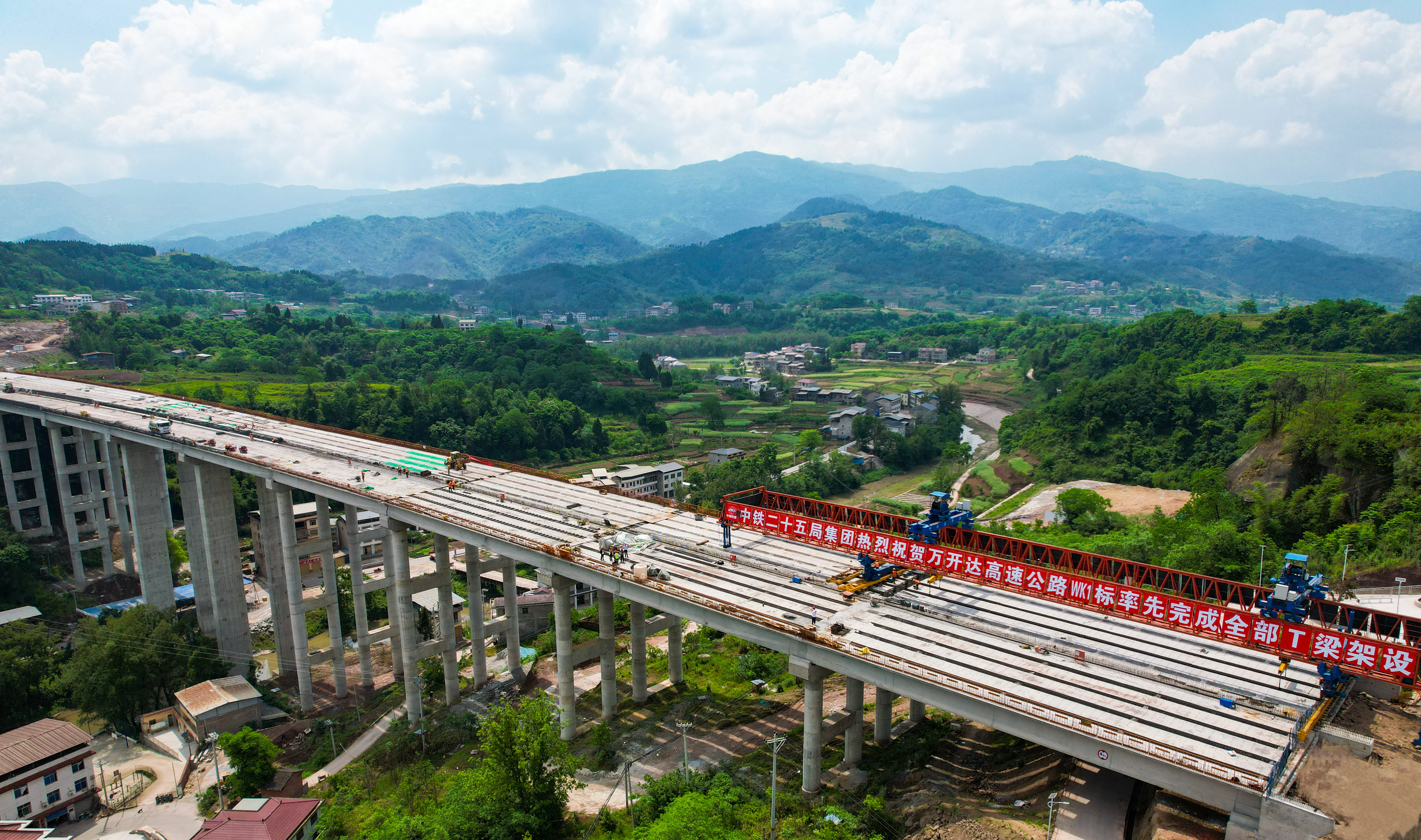 此次贯通的岳溪河大桥,位于开州区南门镇花林村,全长410米,是万开达高速公路重要节点工程,也是所在标段最后一座贯通的大桥。“该桥需上跨243国道,沿着沿线山谷河道布设,地势起伏大,施工场地狭小,雨季洪水频发,施工作业风险高,难度大。”中铁二十五局项目技术负责人杨远波表示。