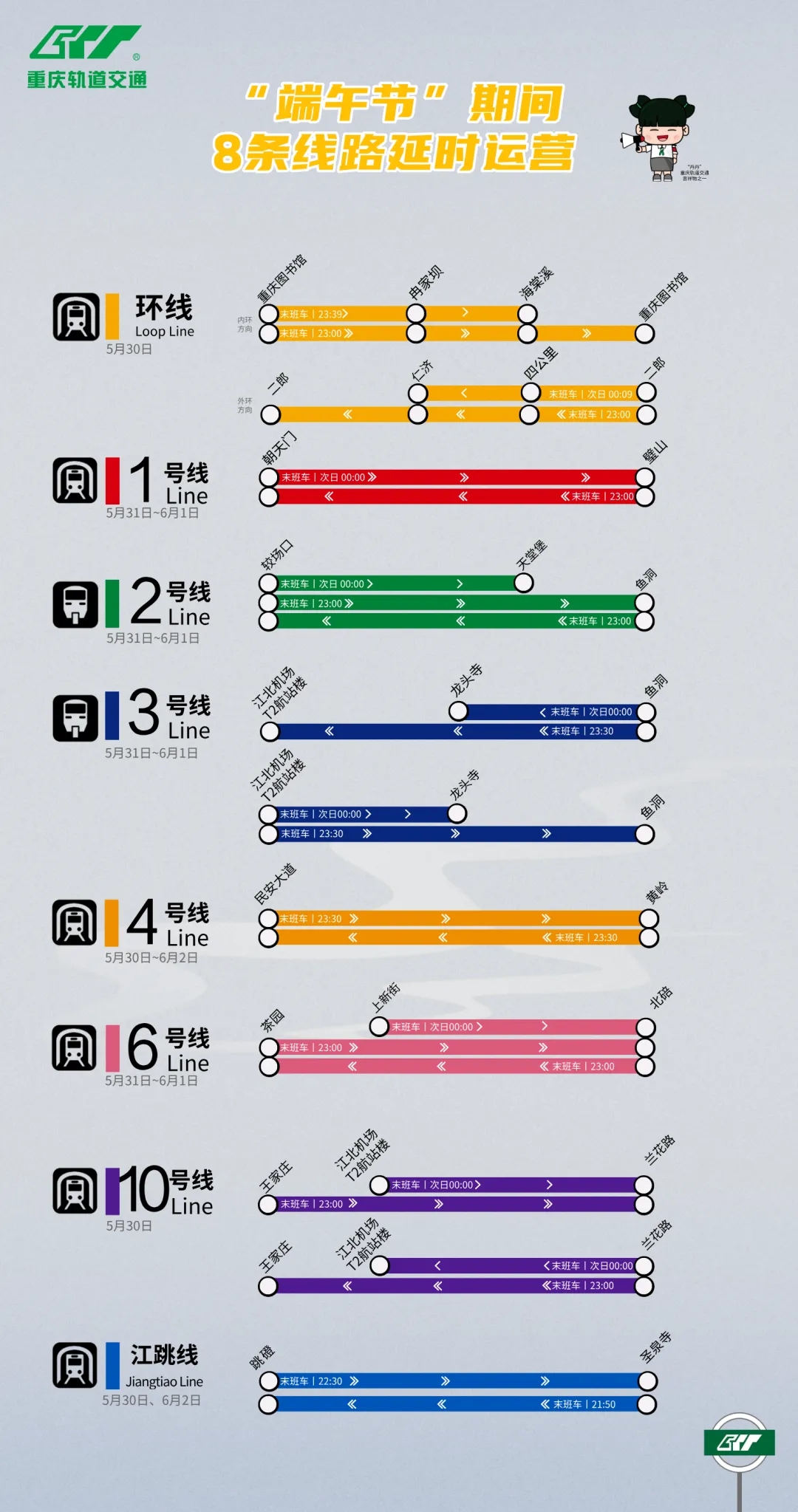 5月30日,线网上线列车385列,节日期间日均上线284列。1号线在5月30日15:00至6月2日运营结束执行全线大交路运行方案,夜间时段组织部分列车在双碑折返;6号线在5月31日至6月1日下午及夜间时段组织部分列车在光电园、上新街折返,增加核心区段运能。