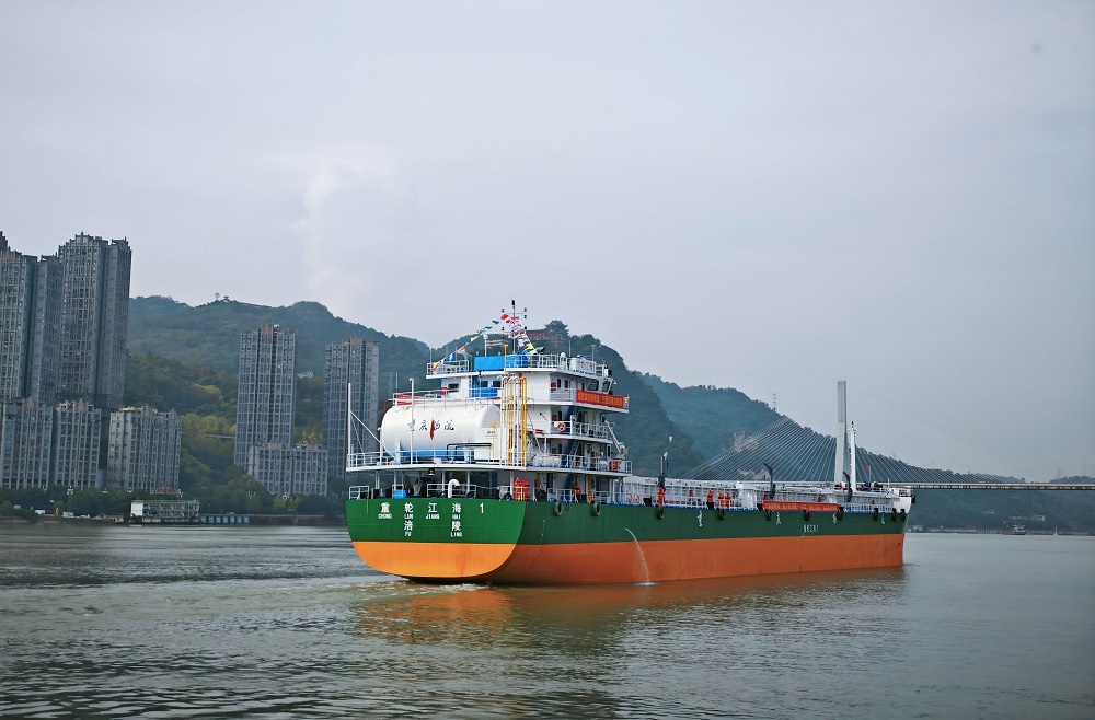 11月11日,由重庆轮船(集团)有限公司投资、中江船业有限公司自主设计建造的重庆首艘江海直达船“重轮江海1”,装载着涪陵华峰化工的5000吨己二酸,在涪陵黄旗港鸣笛启航,发往浙江舟山,开启重庆航运史上具有里程碑意义的新篇章。