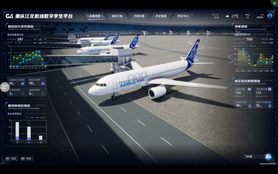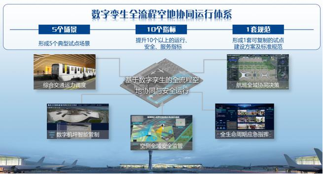 案例依托重庆江北国际机场T3B航站楼及第四跑道工程,聚焦大型枢纽机场多跑道、多航站楼运行中视野屏蔽、低能见度等管制难题,构建了国内首个千万级覆盖全业务、全流程的机场数字孪生系统。系统创新构建“1+6”数字底座,实现空中交通与机场场面的全要素、全流程、全场景一体化映射与协同管控;通过“一屏四图”指挥界面,实现航空器精准定位、路径规划、安全预警等全流程管控;打造空地一体数字生态体系,实现机场、空管、航司技术、业务、数据三融合,构建跨多领域的协同应用场景。项目应用后,航班地面滑行时间可缩短7%,出港延误时间减少7%,低能见度条件下滑错概率降低50%,航班正常性提升至90%以上,靠桥率提升至86%以上,每年节约航空燃油约0.8万吨,减少二氧化碳排放约2.1万吨。成果已在全国多家机场推广,成为民航数字化转型的“重庆方案”。