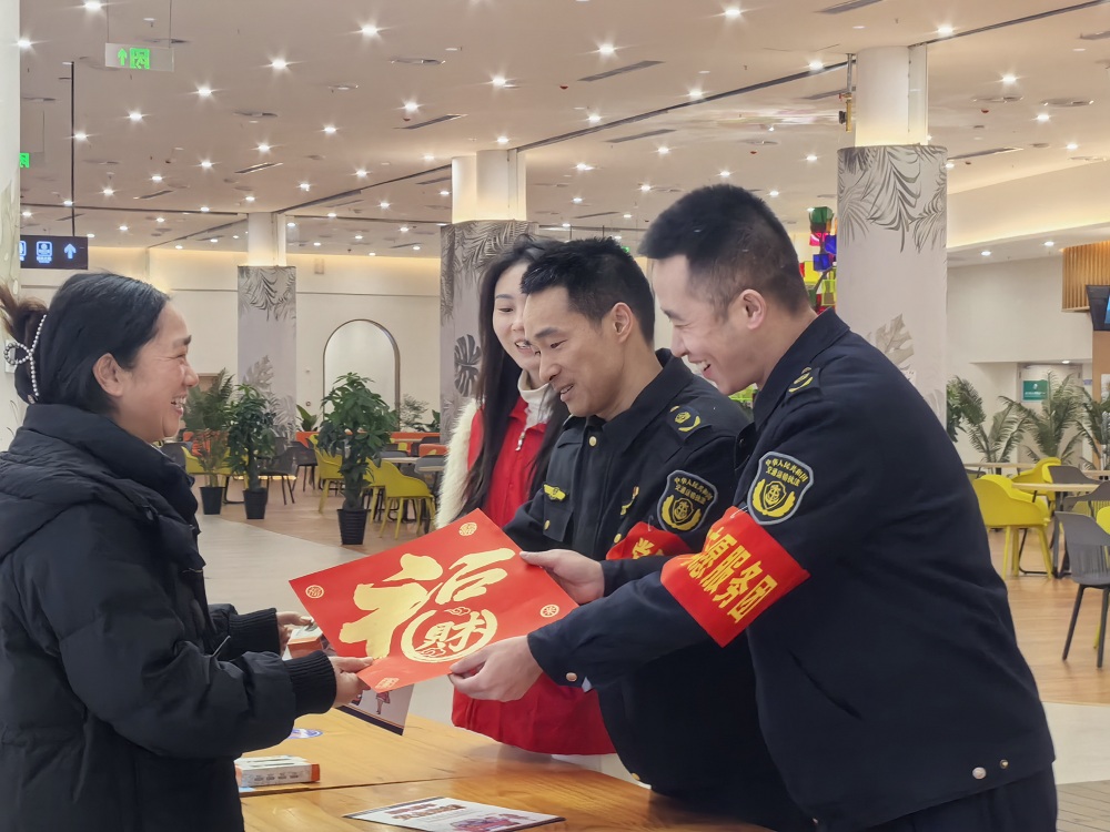执法人员在黎香湖服务区向市民赠送“福”字。