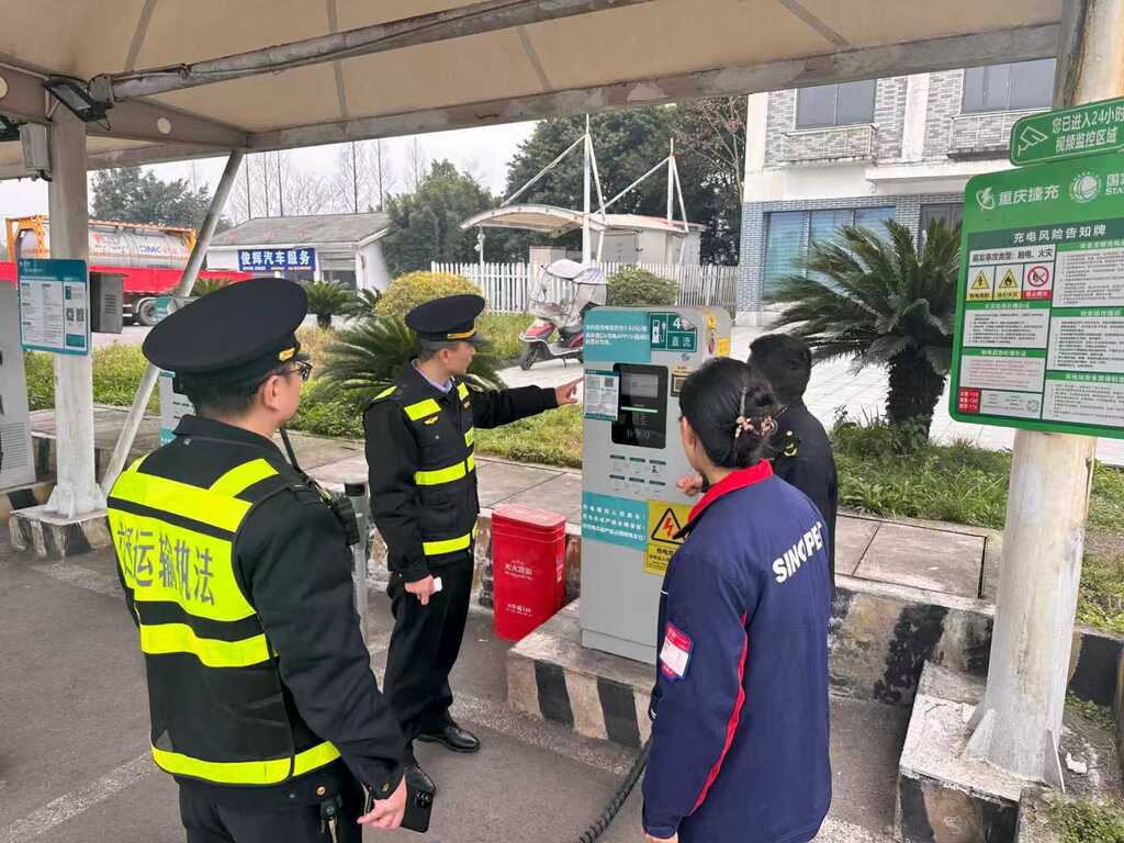 此外,春运期间充电桩使用频次大幅提升。执法人员对服务区充电站开展全方位“体检”,逐一查看充电桩机使用安全,全力保障新能源车主充电安全。