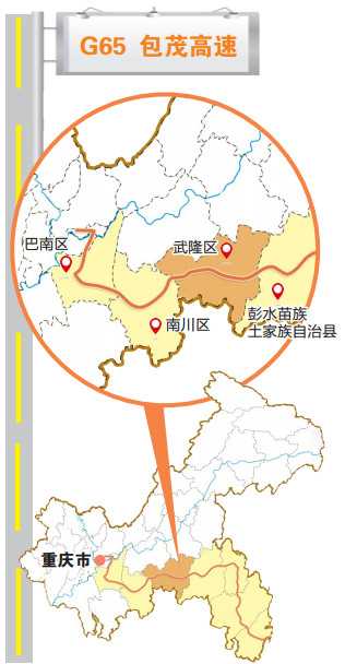 G65南川水江至武隆江口段,崇山峻岭、深沟峭壁。这是一段桥隧比超过75%的高速公路。73公里路程中,有主线桥52座、隧道11座,更有桥隧直接相连及国内罕见的20余公里特长隧道群。