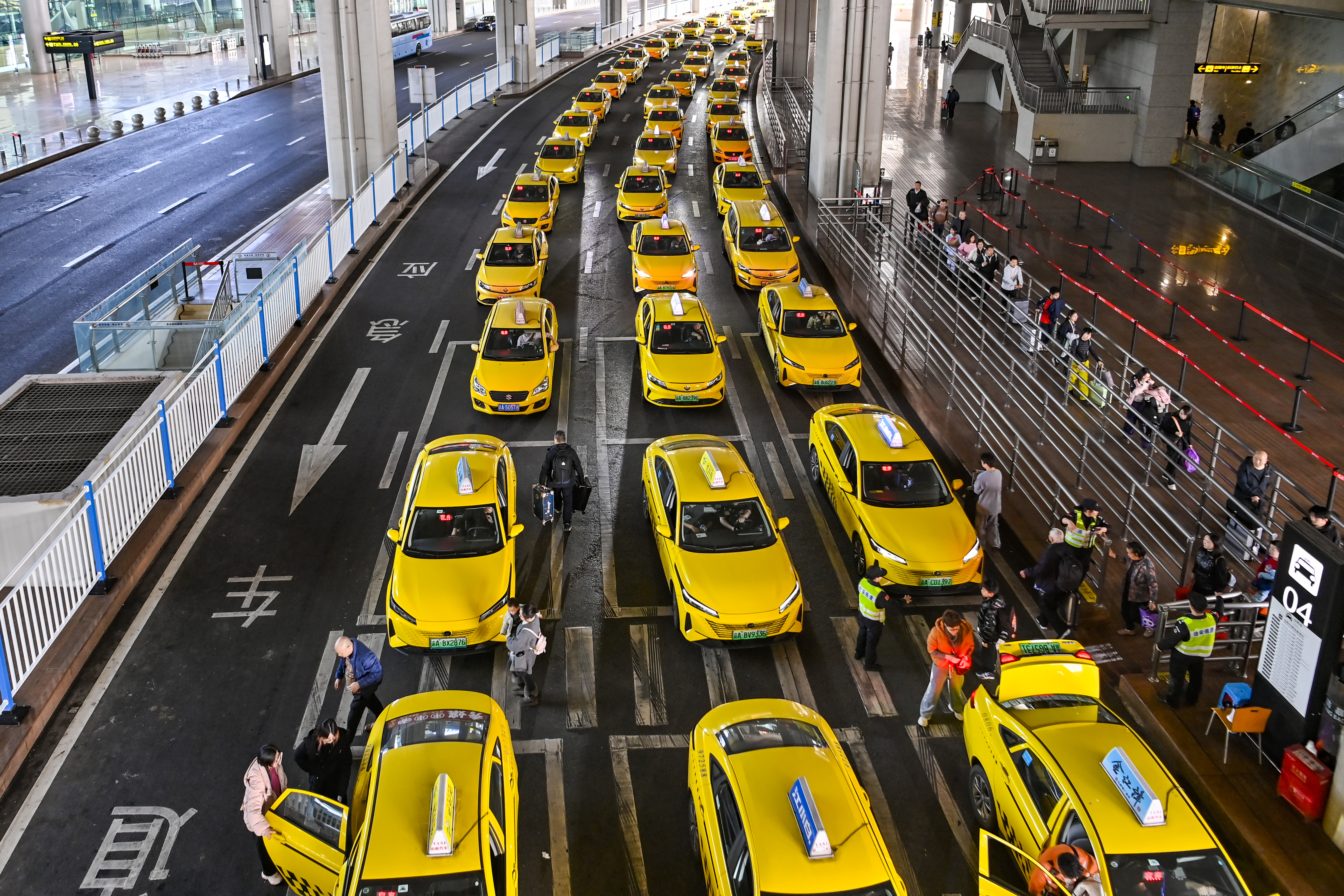2月23日,重庆江北国际机场,大量出租车排队候客。记者 齐岚森 摄