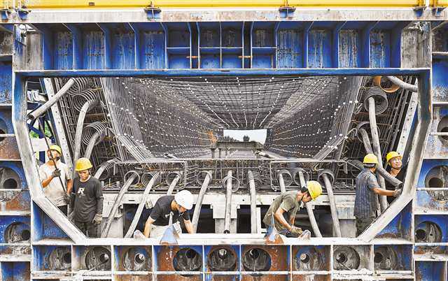 9月10日,位于铜梁区庆隆镇的中铁四局成渝中线重庆段站前2标铜梁制梁场,工人正在安装箱梁的端模。