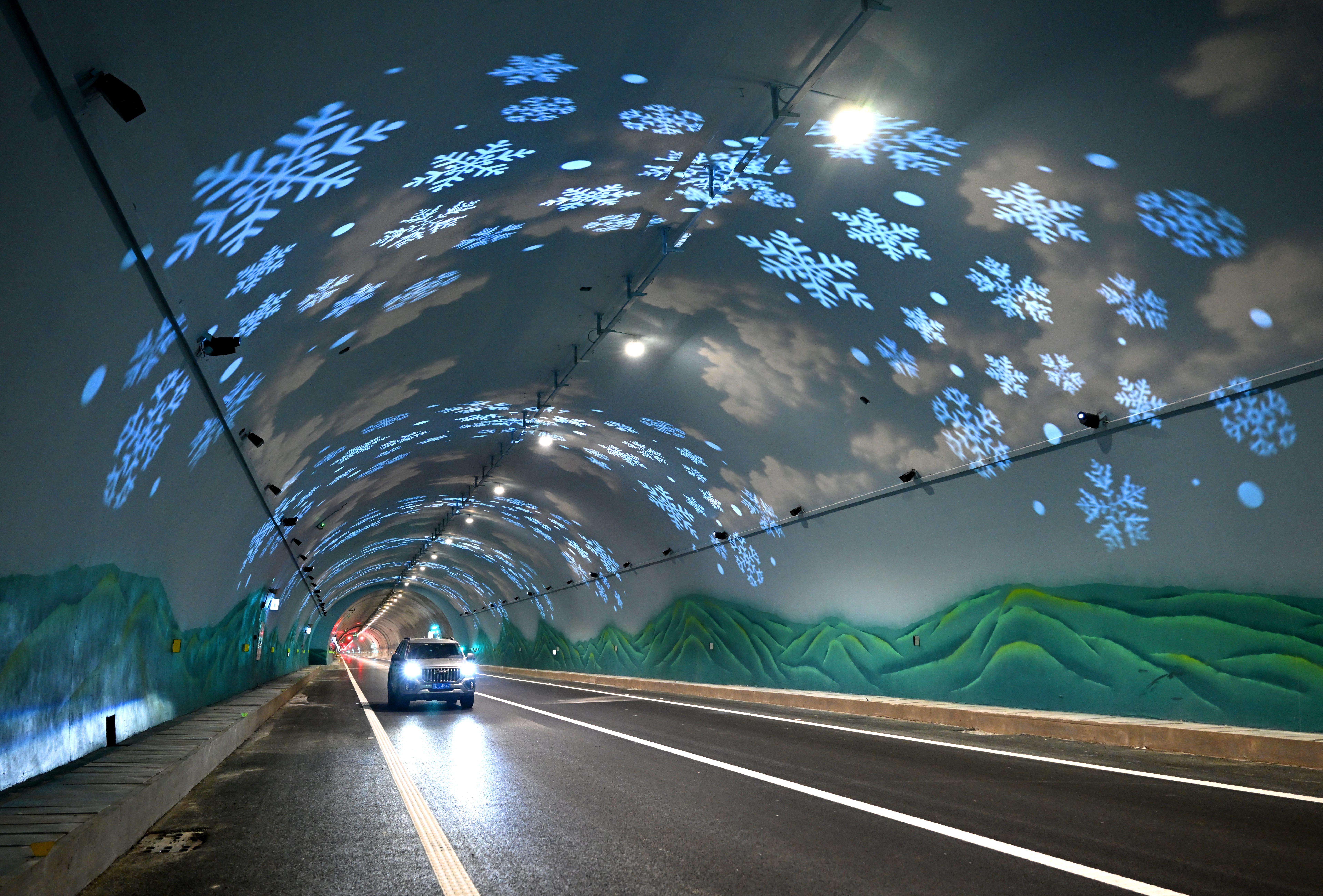 12月16日,渝湘高速复线彭水隧道内根据四季变化显现不同的投影,墙面上的雪花为高速增添一抹冬色。记者 罗斌 摄