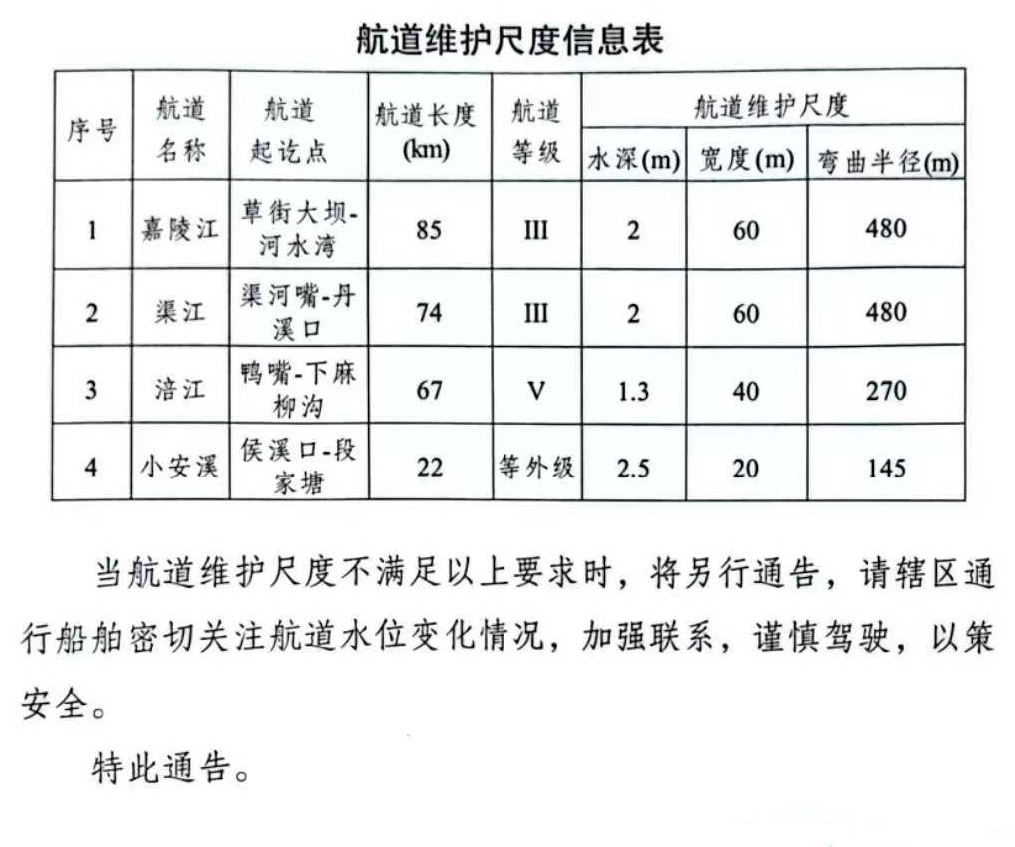 重庆市合川航道管理处关于嘉陵江、渠江、涪江、小安溪航道2025年年12月航道维护尺度计划的航道通告