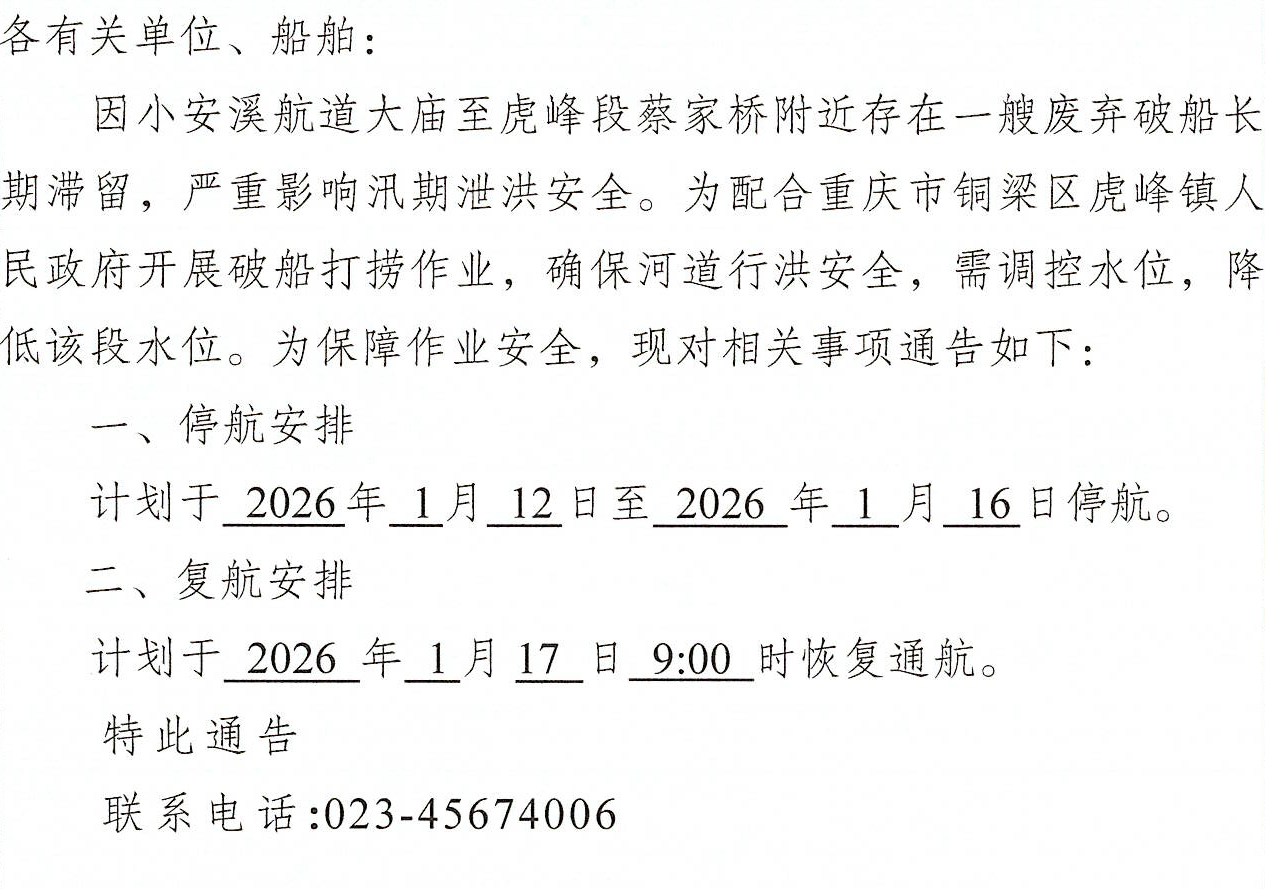 重庆市铜梁船闸管理处关于小安溪航道大庙至虎峰段临时停航的航道通告