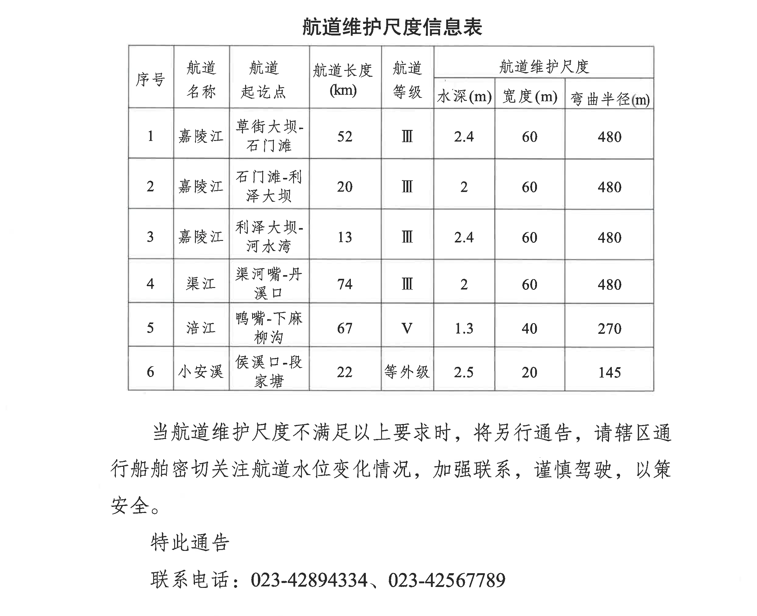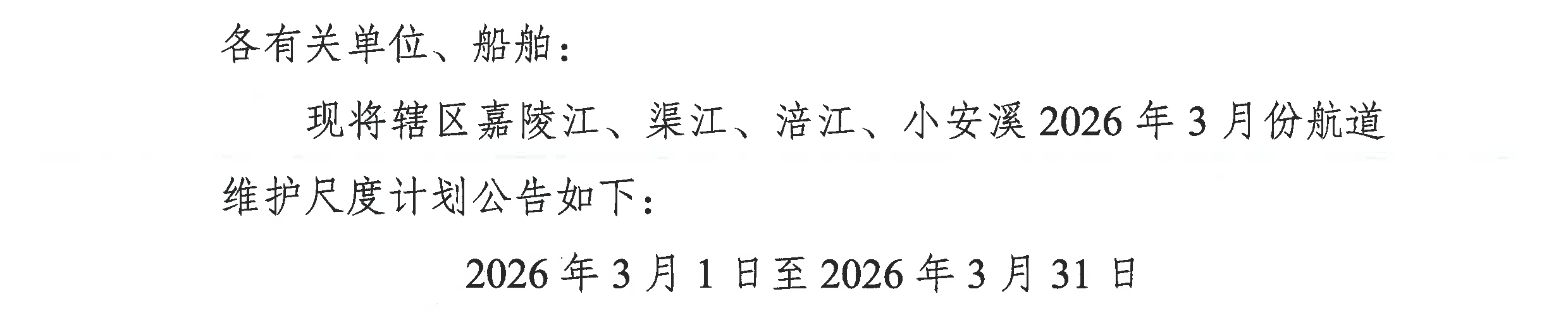 重庆市合川航道管理处关于嘉陵江、渠江、涪江、小安溪航道2026年3月航道维护尺度计划的航道通告