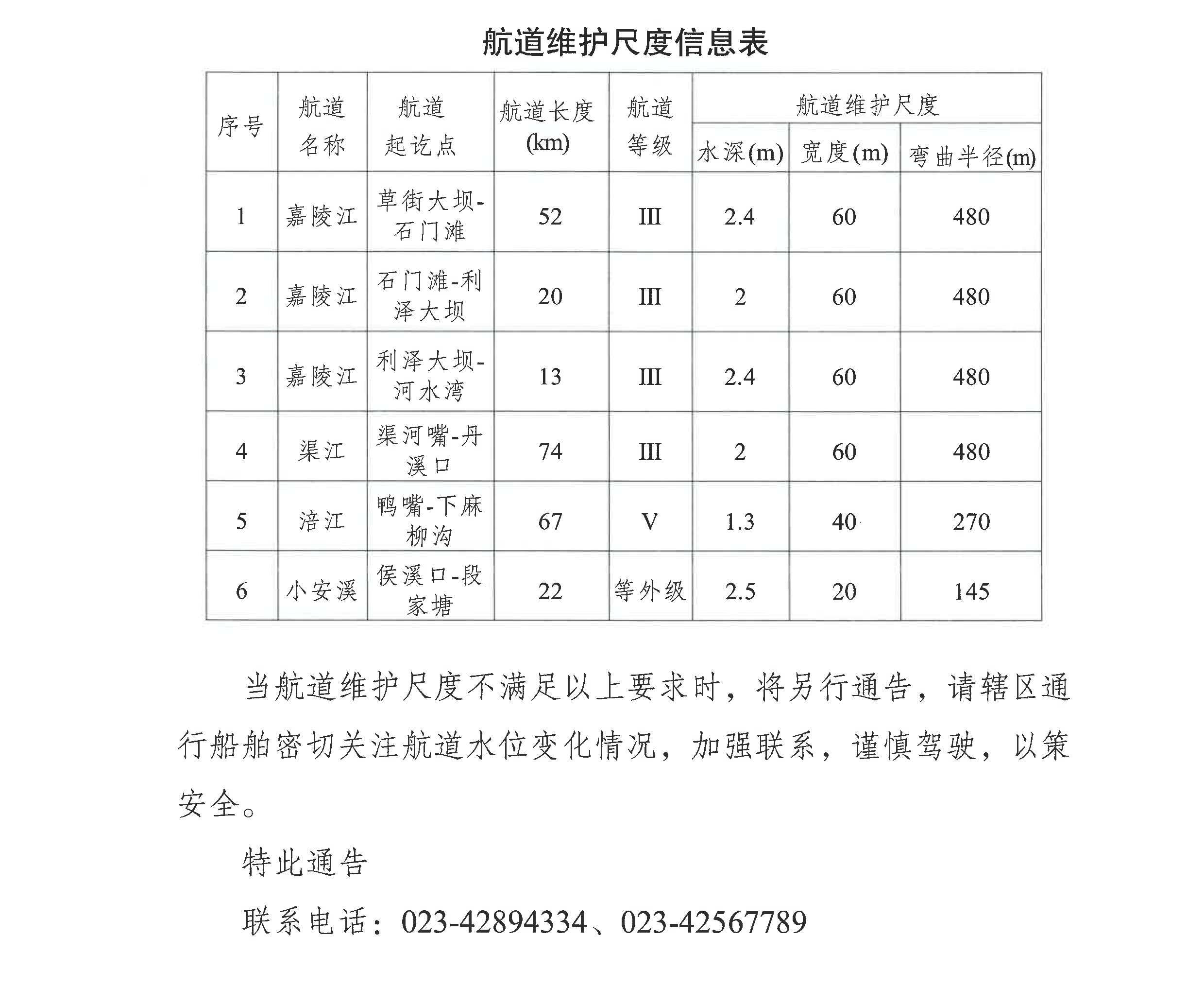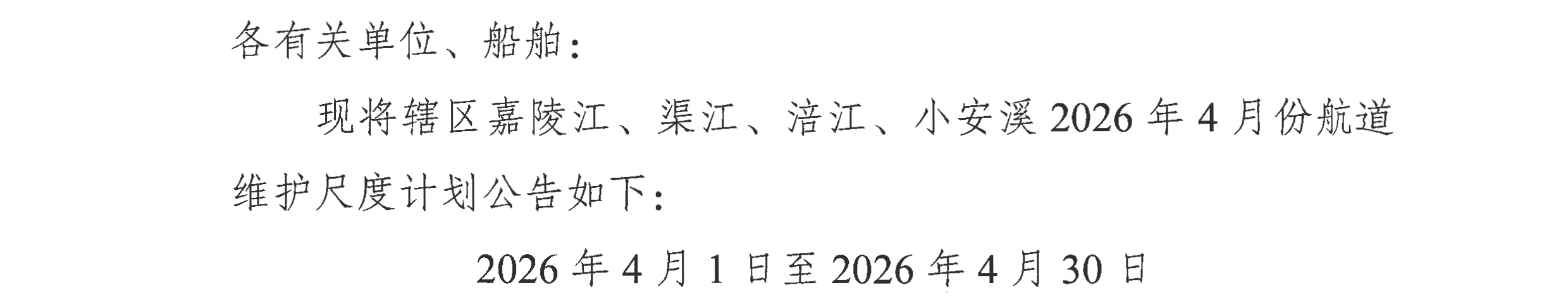 重庆市合川航道管理处关于嘉陵江、渠江、涪江、小安溪航道2026年4月航道维护尺度计划的航道通告