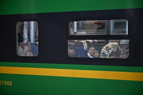 4月6日,重庆北站,一名旅客在车厢内挥手告别。记者 张春晓 摄
