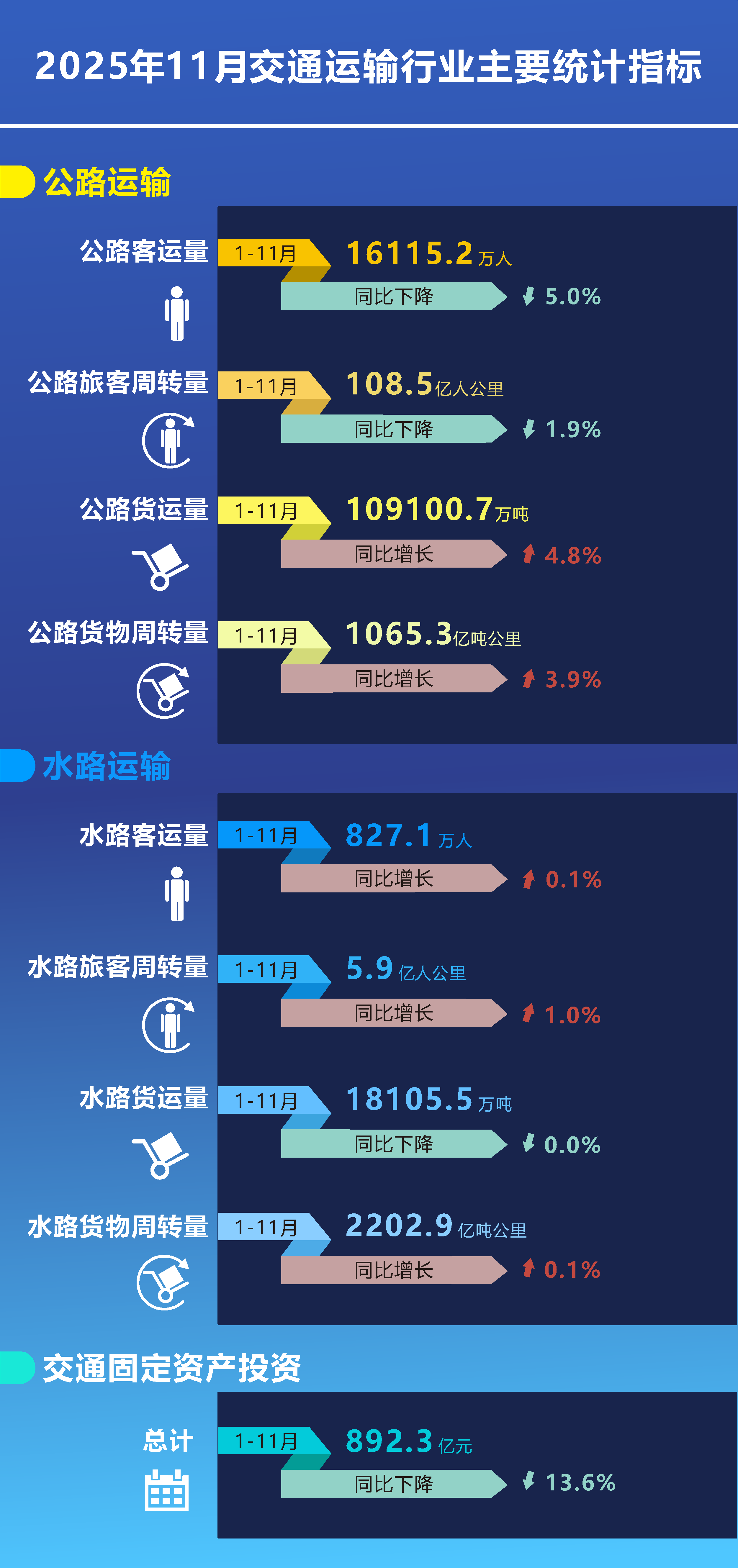 2025年11月公路、水路社会客货运输量及交通固定资产投资完成情况
