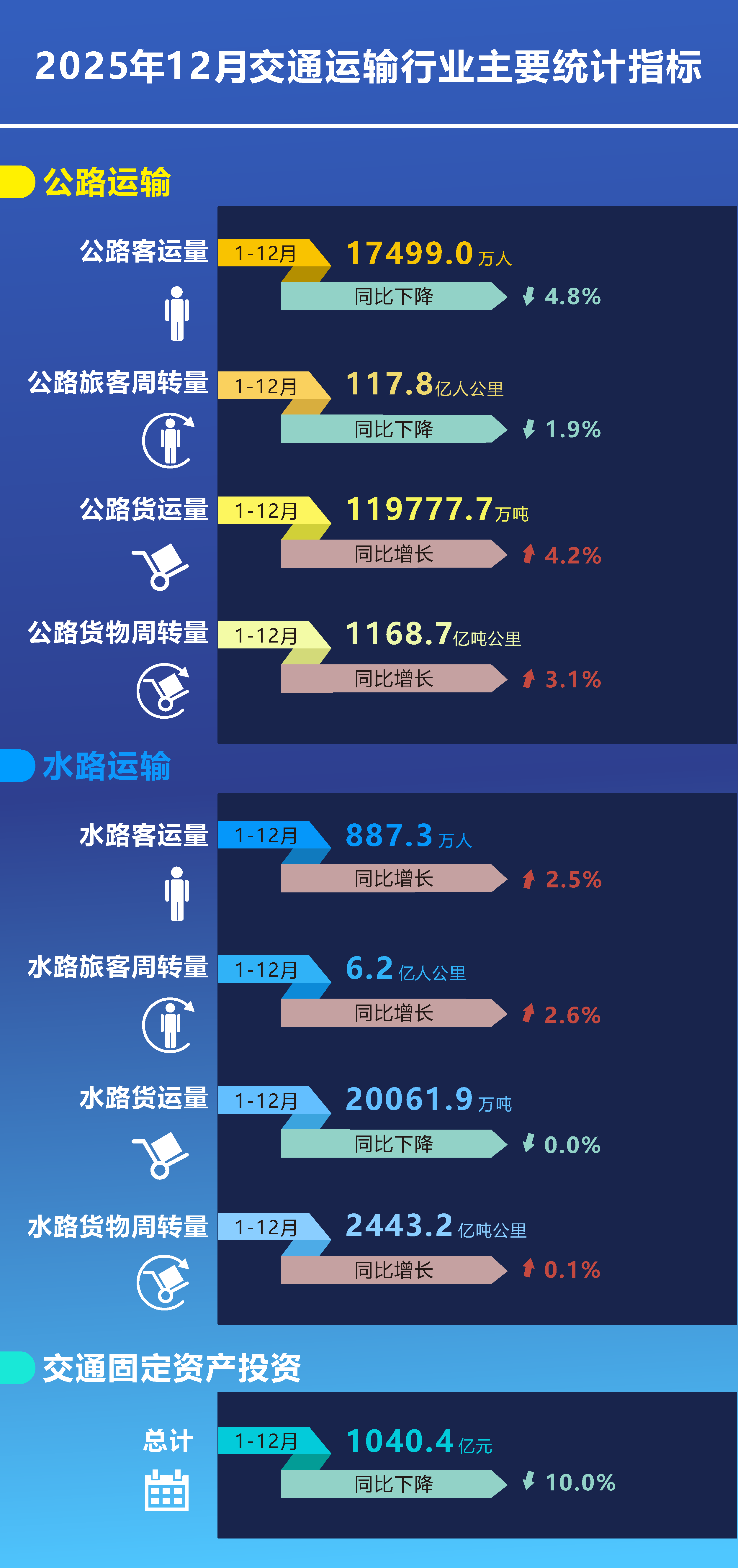 2025年12月公路、水路社会客货运输量及交通固定资产投资完成情况