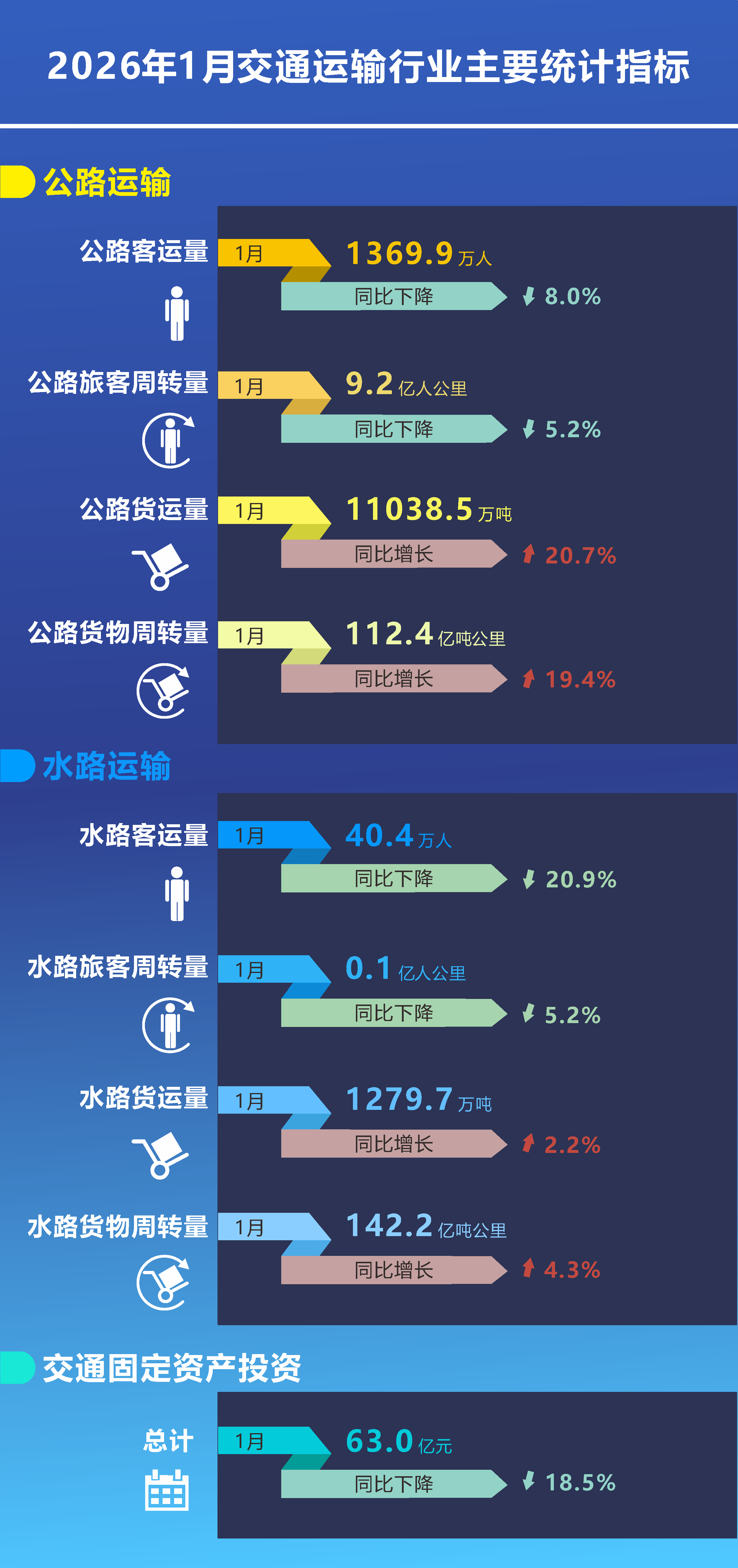 2026年1月公路、水路社会客货运输量及交通固定资产投资完成情况