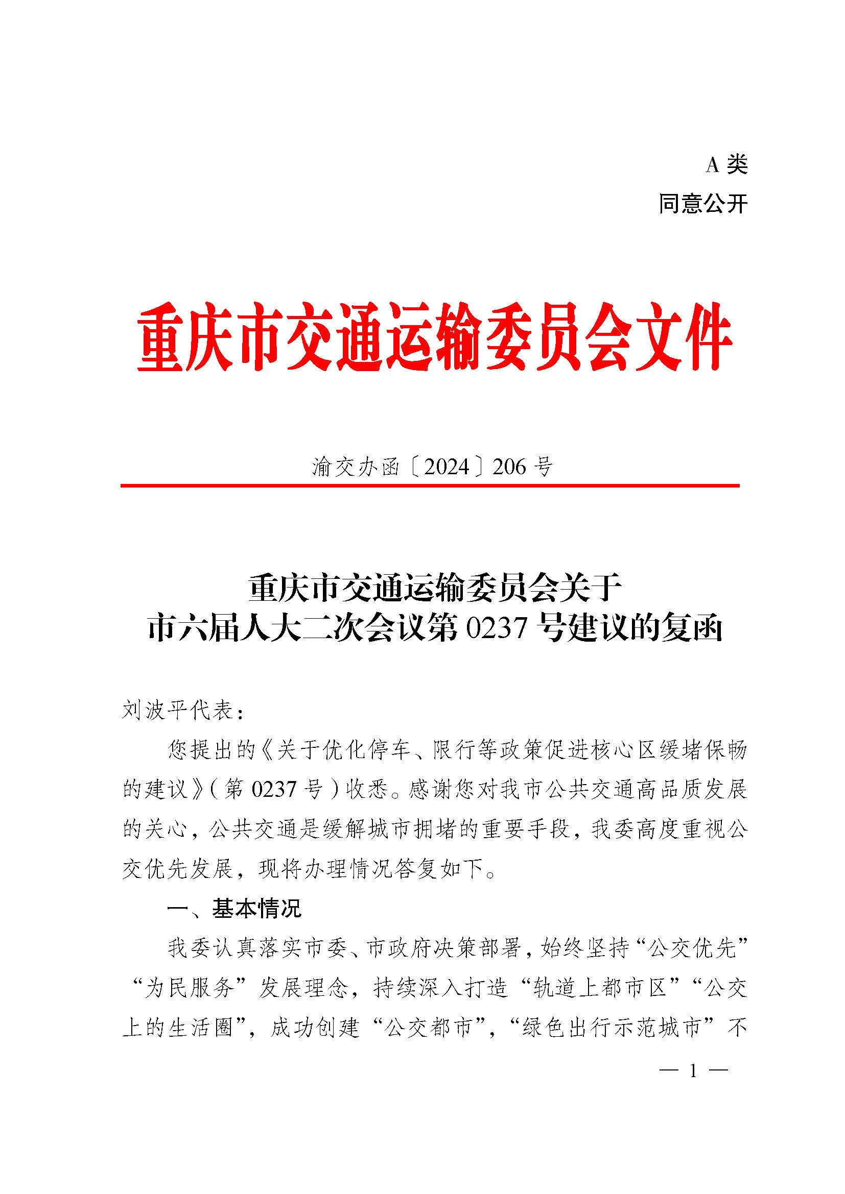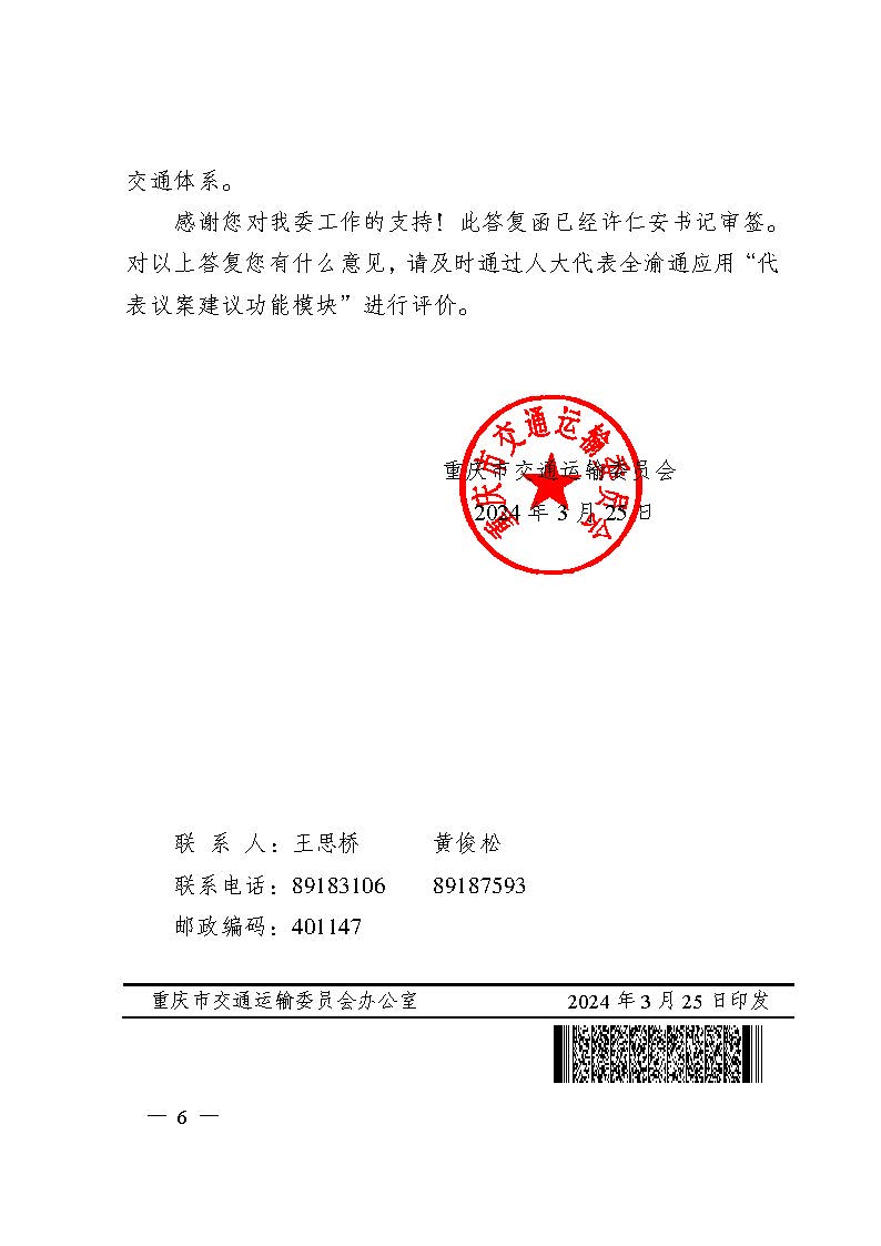 重庆市交通运输委员会关于市六届人大二次会议第0237号建议的复函
