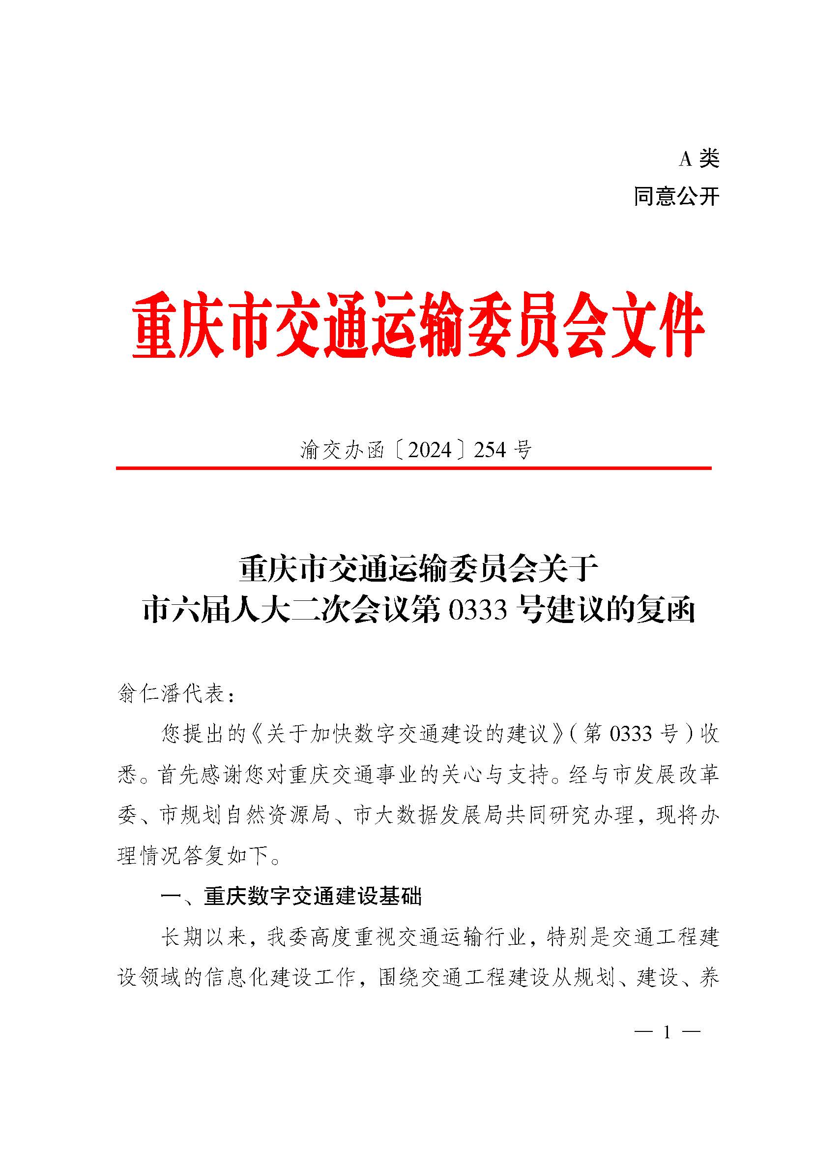 重庆市交通运输委员会关于市六届人大二次会议第0333号建议的复函