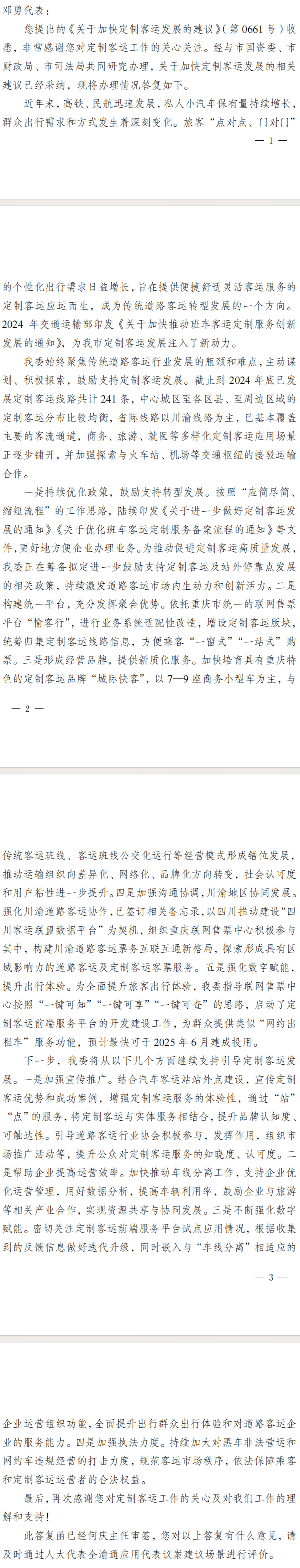 重庆市交通运输委员会关于市六届人大三次会议第0661号建议办理情况的答复函