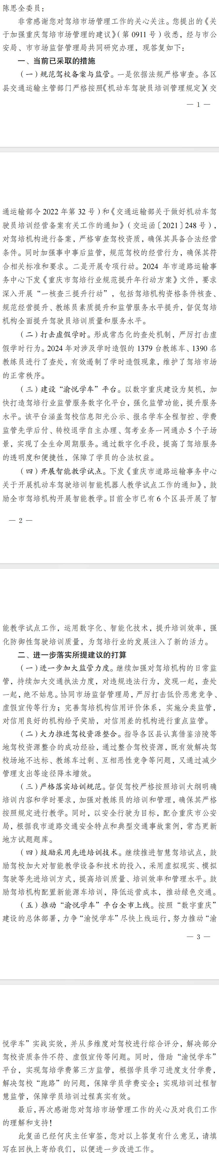 重庆市交通运输委员会关于市政协六届三次会议第0911号提案答复的函