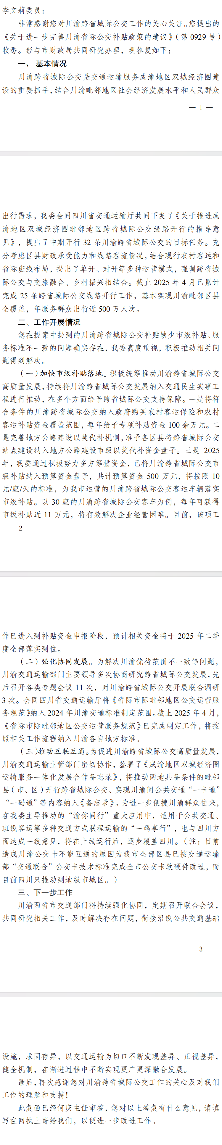 重庆市交通运输委员会关于市政协六届三次会议第0929号提案答复的函