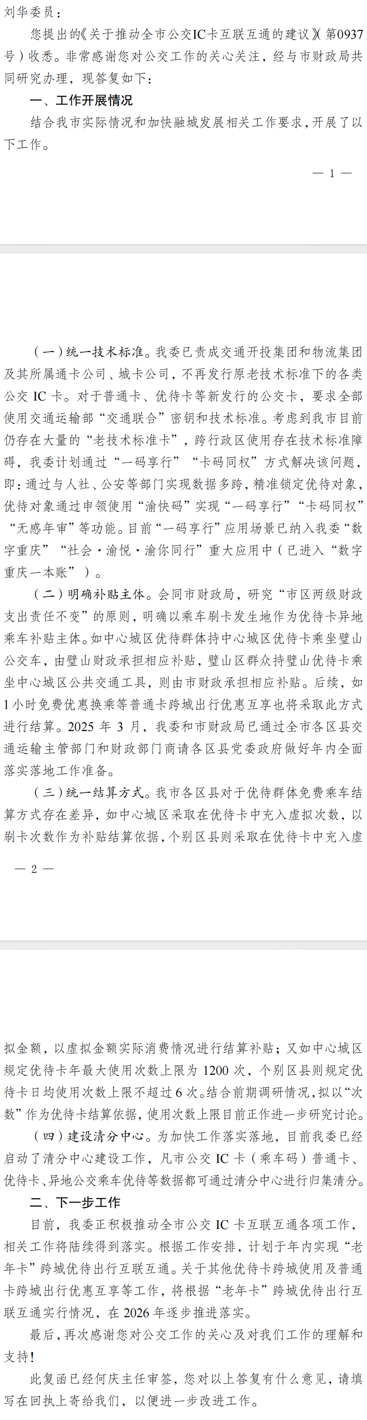 重庆市交通运输委员会关于市政协六届三次会议第0937号提案答复的函
